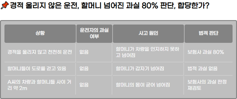 | ๊ฒฝ์ ์ ์ธ๋ฆฌ์ง ์๊ณ ์ฒ์ฒํ ์ด์ | ์์ | ํ ๋จธ๋๊ฐ ์ฐจ๋์ ์ธ์งํ์ง ๋ชปํ๊ณ ๋์ด์ง | ๋ณดํ์ฌ ๊ณผ์ค 80% |