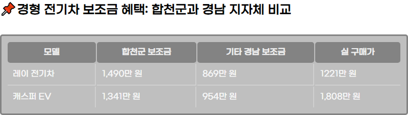๊ฒฝ๋จ ๋ค๋ฅธ ์ง์์ฒด๋ ์ ๊ธฐ์ฐจ ๋ณด์กฐ๊ธ์ ํฉ์ฒ๊ตฐ๋ณด๋ค๋ ์ ๊ฒ ์ง์ํ์ง๋ง, ์ฌ์ ํ ํฐ ํํ์ ์ ๊ณตํฉ๋๋ค. ์๋ฅผ ๋ค์ด, ๊ฑฐ์ ์๋ 2025๋ ์ ๊ธฐ์ฐจ ๋ณด๊ธ์ ์ํด 430๋์ ๋ํ ๋ณด์กฐ๊ธ์ ์ ๊ณตํ๋ฉฐ, ์ด๋ ๊ฑฐ์ ์์์ ์ ๊ธฐ์ฐจ ๊ตฌ๋งค๋ฅผ ์ํ๋ ์๋น์์๊ฒ ์ถฉ๋ถํ ๊ฒฝ์ ์ ํํ์ ์ ๊ณตํฉ๋๋ค. ์ด์ ๊ฐ์ ๋ณด์กฐ๊ธ ์ง์์ ๋ค๋ฅธ ๊ฒฝ๋จ ์ง์ญ์์๋ ์ ๊ณต๋๊ณ ์์ผ๋ฉฐ, ์ ๊ธฐ์ฐจ ๊ตฌ๋งค๋ฅผ ๊ณ ๋ฏผํ๋ ์๋น์์๊ฒ ๋งค์ฐ ์ ๋ฆฌํฉ๋๋ค.