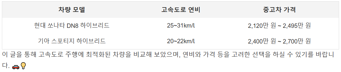 ์ด ๊ธ€์„ ํ†ตํ•ด ๊ณ ์†๋„๋กœ ์ฃผํ–‰์— ์ตœ์ ํ™”๋œ ์ฐจ๋Ÿ‰์„ ๋น„๊ตํ•ด ๋ณด์•˜์œผ๋ฉฐ, ์—ฐ๋น„์™€ ๊ฐ€๊ฒฉ ๋“ฑ์„ ๊ณ ๋ คํ•œ ์„ ํƒ์„ ํ•˜์‹ค ์ˆ˜ ์žˆ๊ธฐ๋ฅผ ๋ฐ”๋ž๋‹ˆ๋‹ค. ๐Ÿš—๐Ÿ’ก