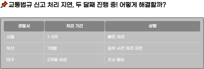 ๊ตํต๋ฒ๊ท ์ ๊ณ ํ ์ฒ๋ฆฌ ์ง์ฐ์ ์ฌ๋ฌ ๊ฐ์ง ์์ธ์ผ๋ก ๋ฐ์ํ ์ ์์ต๋๋ค. ๊ฐ์ฅ ์ค์ํ ์์ธ ์ค ํ๋๋ ๊ฒฝ์ฐฐ์์ ์ ๋ฌด๋์ ๋๋ค. ๊ฐ ๊ฒฝ์ฐฐ์๋ง๋ค ์ ์๋๋ ์ ๊ณ ๊ฑด์๊ฐ ๋ฌ๋ผ, ์ผ๋ถ ์ง์ญ์์๋ ์ ๊ณ ๊ฐ ์ ์๋ ํ ๋น ๋ฅด๊ฒ ์ฒ๋ฆฌ๋๊ธฐ๋ ํ์ง๋ง, ๋ค๋ฅธ ์ง์ญ์์๋ ์๋์ ์ผ๋ก ๊ธด ์๊ฐ์ด ์์๋ ์ ์์ต๋๋ค.