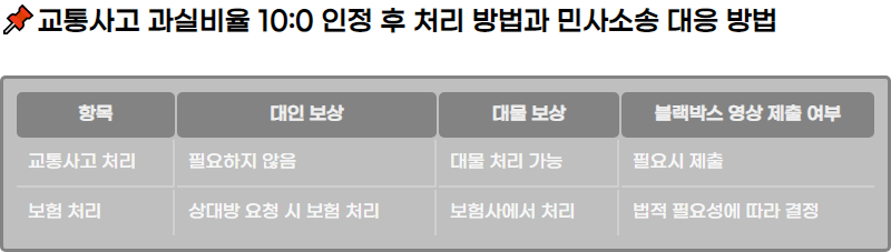 κ΅ν΅μ¬κ³ κ° λ°μνμ λ κ³Όμ€λΉμ¨μ λͺ νν νλ κ²μ μ¬κ³ μ²λ¦¬μ ν΅μ¬μ λλ€. λ§μ½ κ΅ν΅μ¬κ³ μμ 10:0 κ³Όμ€λΉμ¨μ μΈμ νκ² λλ€λ©΄, μ¬κ³ μ μ± μμ λͺ νν νκ³ λ³΄ν μ²λ¦¬ λν κ°νΈν΄μ§λλ€. μ¬κ³ νμ₯μμ μλλ°©κ³Όμ νμ ν 10:0 κ³Όμ€λΉμ¨μ μΈμ νλ κ²μ μ¬κ³ νμ λ°μν μ μλ λ²μ λΆμμ λ―Έμ°μ λ°©μ§ν μ μμ΅λλ€.