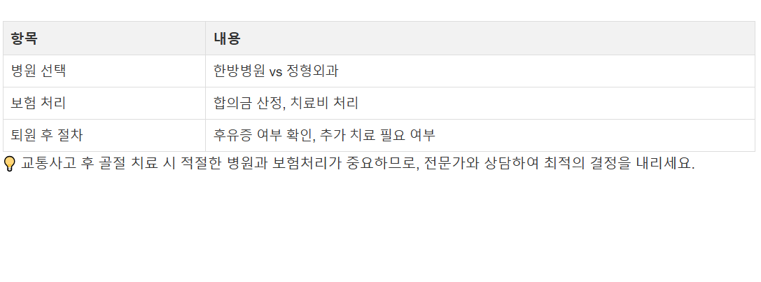 ๐ก ๊ตํต์ฌ๊ณ ํ ๊ณจ์ ์น๋ฃ ์ ์ ์ ํ ๋ณ์๊ณผ ๋ณดํ์ฒ๋ฆฌ๊ฐ ์ค์ํ๋ฏ๋ก, ์ ๋ฌธ๊ฐ์ ์๋ดํ์ฌ ์ต์ ์ ๊ฒฐ์ ์ ๋ด๋ฆฌ์ธ์.