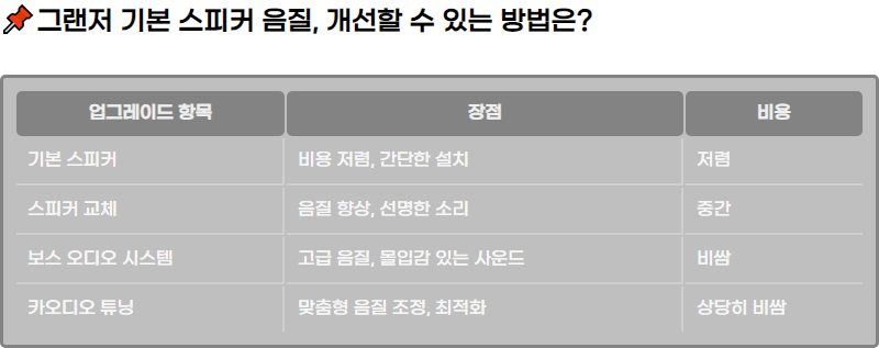 ๋ณด์ค ์ค๋์ค ์์คํ ์ ๊ทธ๋์ ์ ๊ฐ์ ๊ณ ๊ธ ์ฐจ๋์ ์ ํฉํ ์ค๋์ค ์๋ฃจ์ ์ ๋๋ค. ๋ณด์ค๋ ๋ฐ์ด๋ ์์ง๊ณผ ํจ๊ป, ์ฐจ๋ ๋ด์์ ์ต์์ ์ฌ์ด๋๋ฅผ ์ ๊ณตํฉ๋๋ค. ๋ณด์ค ์์คํ ์ ์ค์นํ๋ฉด ๊ธฐ๋ณธ ์คํผ์ปค์ ์์ง์ ํฌ๊ฒ ํฅ์์ํฌ ์ ์์ผ๋ฉฐ, ์์ ์ ๋์ฑ ์๋๊ฐ ์๊ฒ ๋ค์ ์ ์์ต๋๋ค.