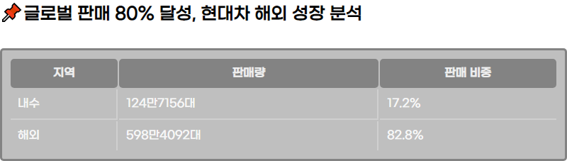 현대차가 해외에서 80% 이상의 판매 비중을 기록하는 것은 회사가 전 세계적인 자동차 시장에서 점차 확고한 입지를 굳혀가고 있다는 뜻입니다. 특히 북미와 유럽, 아시아 태평양 지역에서의 성장이 이를 뒷받침합니다. 이러한 성과는 단순한 판매 숫자에 그치지 않고, 현대차가 기술력과 브랜드 신뢰도를 바탕으로 글로벌 시장에서 경쟁력을 확보하고 있음을 보여줍니다.