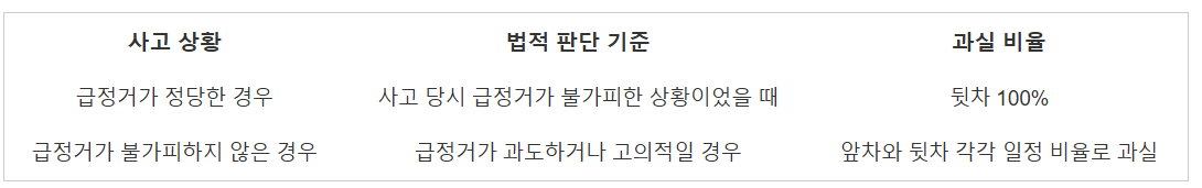 ๊ธ์ ๊ฑฐ๋ก ์ธํด ๋ฐ์ํ ์ฌ๊ณ ์์๋ ๋ค๋ฐ๋ผ์ค๋ ์ฐจ๋์ด ๊ณผ์ค์ 100% ๋ ์๋ ๊ฒฝ์ฐ๊ฐ ์ผ๋ฐ์ ์ ๋๋ค. ์ฌ๊ณ ๊ฐ ๋ฐ์ํ๋ฉด ๋๋ถ๋ถ ๋ท์ฐจ๊ฐ ์์ฐจ๋ฅผ ์ถ๋ํ๋ ํํ๊ฐ ๋์ด ๊ณผ์ค์ด ๋ท์ฐจ์ ์ง์ค๋ฉ๋๋ค. ๊ทธ๋ฌ๋ ๊ธ์ ๊ฑฐ๊ฐ ๋ฐ์ํ ์์ธ์ ๋ฐ๋ผ ์ํฉ์ ๋ฌ๋ผ์ง ์ ์์ต๋๋ค. ์๋ฅผ ๋ค์ด, ์์ฐจ๊ฐ ๊ธ์ ๊ฑฐ๋ฅผ ํ๋ ์ด์ ๊ฐ ์ ๋นํ ๊ฒ์ธ์ง ์ฌ๋ถ๊ฐ ์ค์ํ ํ๋จ ๊ธฐ์ค์ด ๋ฉ๋๋ค.