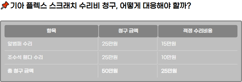 ๊ณผ๋ค ์ฒญ๊ตฌ๊ฐ ์์ฌ๋๋ฉด, ์ฐ์ ์๋ฆฌ ๋ด์ญ์ ๋ํ ๋ช ํํ ํ์ธ์ด ํ์ํฉ๋๋ค. ์ฐจ๋ ๋ฐ๋ฉ ํ ์ฒญ๊ตฌ๋ ์๋ฆฌ๋น๊ฐ ์ ์ ํ์ง ํ์ธํ๊ธฐ ์ํด์๋, ํด๋น ์๋ฆฌ ๋ด์ญ์ ๋ํ ์ธ๋ถ ์ฌํญ์ ์์ฒญํ๋ ๊ฒ์ด ์ค์ํฉ๋๋ค. ์ฒญ๊ตฌ๋ 50๋ง์์ด ๊ณผ๋ํ ๊ฒ์ธ์ง ์๋์ง๋ฅผ ํ๋จํ๋ ค๋ฉด, ๋ค๋ฅธ ์ ๋น์์์ ๋น๊ต ๊ฒฌ์ ์ ๋ฐ์๋ณผ ํ์๊ฐ ์์ต๋๋ค. ์ฌ๋ฌ ์ ๋น์์์ ์๋ฆฌ ๊ฒฌ์ ์ ๋ฐ์ผ๋ฉด, ์ ์ ํ ๊ฐ๊ฒฉ์ ํ์ธํ๊ณ ๋ถํ์ํ ๋น์ฉ์ ์ง๋ถํ๋ ์ผ์ ๋ง์ ์ ์์ต๋๋ค.