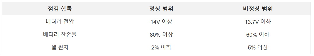 ์ ๊ธฐ์ ๊ฒ์ ๋ณดํต ๊ธฐ๋ณธ์ ์ธ ๋ถํ ์ ๊ฒ๋ง ํฌํจ๋์ด ์์ผ๋ฉฐ, ๋ฐฐํฐ๋ฆฌ์ ์์กด์จ์ด๋ ์ ํธ์ฐจ์ ๋ํ ์์ธํ ์ ๋ณด๋ ํฌํจ๋์ง ์์ต๋๋ค. ๋ฐ๋ผ์, ๋ฐฐํฐ๋ฆฌ ์ฑ๋ฅ์ ๋ํ ์ฐ๋ ค๊ฐ ์๋ค๋ฉด ์ ๊ธฐ์ ๊ฒ ์ ๋ฐฐํฐ๋ฆฌ์ ๋ํ ์ธ๋ถ์ ์ธ ์ ๊ฒ์ ์์ฒญํ๋ ๊ฒ์ด ์ค์ํฉ๋๋ค. ๋ํ, ์ด๋ฌํ ์์ฒญ์ ์ ํ ๋ฏผํ๊ฐ ์๋๋ฉฐ, ์ฐจ๋์ ์์ ์ ์ํด ํ์ํ ์กฐ์น์ ๋๋ค.