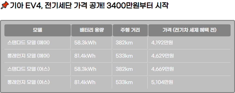 EV4์ ๊ฐ๊ฒฉ์ ์ ๊ธฐ์ฐจ ์ธ์ ํํ์ ์ ์ฉํ๊ธฐ ์ ๊ธฐ์ค์ผ๋ก, ์คํ ๋ค๋ ๋ชจ๋ธ์ ๊ฒฝ์ฐ ํธ๋ฆผ๋ณ๋ก โฒ์์ด 4,192๋ง์ โฒ์ด์ค 4,669๋ง์ โฒGT ๋ผ์ธ 4,783๋ง์์ ๋๋ค. ๋กฑ๋ ์ธ์ง ๋ชจ๋ธ์ โฒ์์ด 4,629๋ง์ โฒ์ด์ค 5,104๋ง์ โฒGT ๋ผ์ธ 5,219๋ง์์ผ๋ก ์ฑ ์ ๋์์ต๋๋ค. ๊ฐ๊ฒฉ์ ์ ๊ธฐ์ฐจ์ ์ฃผ์ ๊ตฌ๋งค ์์์ธ ์ถฉ์ ์ฃผํ๊ฑฐ๋ฆฌ์ ๋ฐฐํฐ๋ฆฌ ์ฉ๋์ ๋ฐ๋ผ ๋ค๋ฅด๋ฉฐ, ๊ธฐ๋ณธ์ ์ผ๋ก ๋ค์ํ ์๋น์์ ์๊ตฌ๋ฅผ ์ถฉ์กฑ์ํฌ ์ ์๋๋ก ์ค๊ณ๋์์ต๋๋ค.