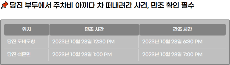 ์ ํ๋ ์ฃผ์ฐจ๋ฅผ ๊ณ ๋ คํ ๋ ์ค์ํ ๋ง์กฐ์ ๊ฐ์กฐ ์๊ฐ์ ๋ช ํํ ์๋ ค์ฃผ๋ ์์์ ๋๋ค. ์ด์ฒ๋ผ ํด์๊ฐ์์ ์ฃผ์ฐจํ ๋๋ ๋ง์กฐ ์๊ฐ๊ณผ ๊ฐ์กฐ ์๊ฐ์ ๋ํ ์ ๋ณด๋ฅผ ํ์ธํ๊ณ , ๊ฐ๋ฅํ๋ฉด ํด์๋ฉด ๋ณํ๊ฐ ํฐ ์ง์ญ์์์ ์ฃผ์ฐจ๋ฅผ ํผํ๋ ๊ฒ์ด ์ข์ต๋๋ค.