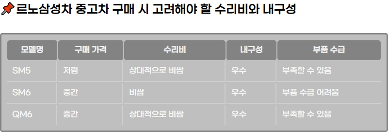 ํนํ, ๋ฅด๋ ธ์ผ์ฑ์ฐจ ์ค SM6์ QM6 ๋ชจ๋ธ์ ๋ด๊ตฌ์ฑ ๋ฉด์์ ๊ธ์ ์ ์ธ ํ๊ฐ๋ฅผ ๋ฐ๊ณ ์์ต๋๋ค. ์ด๋ค ์ฐจ๋์ ๊ณ ๊ธ ๊ธฐ์ ์ด ๊ฒฐํฉ๋์ด ์ฐจ๋์ ๋ด๊ตฌ์ฑ์ด ๋ฐ์ด๋ ํธ์ ๋๋ค. SM5 ๋ชจ๋ธ์ ํนํ ์ฅ๊ฑฐ๋ฆฌ ์ด์ ์ ๋ด๊ตฌ์ฑ์ด ๋์ ๊ณ ์ฅ์ด ์ ์ ํธ์ผ๋ก ์๋ ค์ ธ ์์ต๋๋ค.