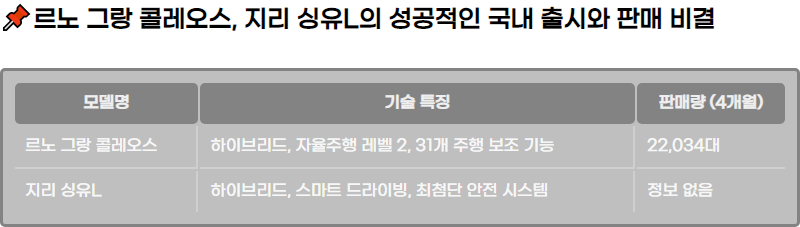์ต๊ทผ ๋ฅด๋ ธ ๊ทธ๋ ์ฝ๋ ์ค์ค๊ฐ ๊ตญ๋ด ํ์ด๋ธ๋ฆฌ๋ SUV ์์ฅ์์ ํฐ ์ฑ๊ณต์ ๊ฑฐ๋๋ฉฐ ์ฃผ๋ชฉ์ ๋ฐ๊ณ ์์ต๋๋ค. ์ด ๋ชจ๋ธ์ ์ง๋ฆฌ ์ฑ์ L์ ๊ธฐ๋ฐ์ผ๋ก ํ์ฌ ๋ฅด๋ ธ ๋ธ๋๋๋ก ์ถ์๋์์ต๋๋ค. ์ง๋ฆฌ ์๋์ฐจ ๊ทธ๋ฃน์ด ๋ฅด๋ ธ์ฝ๋ฆฌ์์ ์ง๋ถ 35%๋ฅผ ์ธ์ํ๊ณ 2๋ ์ฃผ์ฃผ๋ก ์ฌ๋ผ์๋ฉด์, ๋ ๋ธ๋๋์ ํ์ ์ด ๋ง๋ค์ด๋ธ ๊ฒฐ์ค์ด๋ผ ํ ์ ์์ต๋๋ค. ์ด ํ์ ์ ์ง๋ฆฌ ์๋์ฐจ๊ฐ ๊ตญ๋ด ์์ฅ์ ๋ง๋ ๋ชจ๋ธ์ ์ถ์ํ๋ฉฐ ํ๋์ฐจ์์ ๊ฒฝ์์ ๋ณธ๊ฒฉ์ ์ผ๋ก ์์ํ๋ ๊ณ๊ธฐ๊ฐ ๋์์ต๋๋ค.