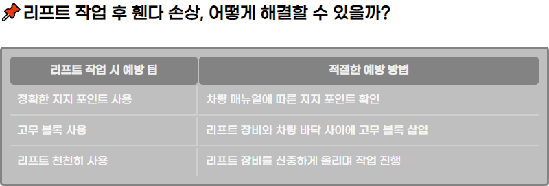 리ννΈ μμ μ κ³ λ¬΄ λΈλ‘μ΄λ λ무 λΈλ‘μ μ¬μ©νμ¬ μ°¨λ λ°λ₯κ³Ό 리ννΈ μ₯λΉ κ°μ 좩격μ ν‘μν΄μΌ ν©λλ€. μ΄λ‘ μΈν΄ 리ννΈ μ₯λΉμ κΈμ λΆλΆμ΄ μ°¨λκ³Ό μ§μ μ μ΄νμ§ μκ² λλ©°, νλ€λ μ¬μ΄λ μ€μ»€νΈμ κ°μ λΆμκ° μμλλ κ²μ μλ°©ν μ μμ΅λλ€. λν, 리ννΈλ₯Ό μ²μ²ν μ‘°μ¬μ€λ½κ² μ¬λ¦¬λ©΄μ μμ μ μ§ννλ κ²μ΄ μ€μν©λλ€.