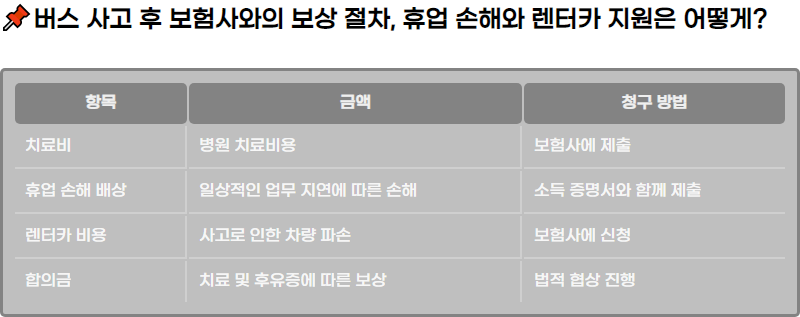 μ μ°¨ μ€ λ°μν κ΅ν΅μ¬κ³ λ νΌν΄μμκ² μ¬κ°ν μ 체μ λ° μ μ μ νΌν΄λ₯Ό μκΈΈ μ μμ΅λλ€. νΉν, λ²μ€μμ μ¬κ³ κ° λ°μν κ²½μ° μ¬κ³ κ³Όμ€μ΄ λͺ ννκ² λλ¬λμ§ μκ±°λ 보νμ²λ¦¬ κ³Όμ μμ μ΄λ €μμ κ²ͺμ μ μμ΅λλ€. λ³Έ κΈμμλ λ²μ€ μ¬κ³ ν 보νμ¬μμ 보μ μ μ°¨μ λν΄ μμΈν μ€λͺ λ리며, νΉν ν΄μ μν΄ λ°°μκ³Ό λ ν°μΉ΄ λΉμ© μ§μ λ± μ€μ§μ μΈ λ³΄μ μ²κ΅¬ λ°©λ²μ λν΄μλ λ€λ£¨κ² μ΅λλ€.
