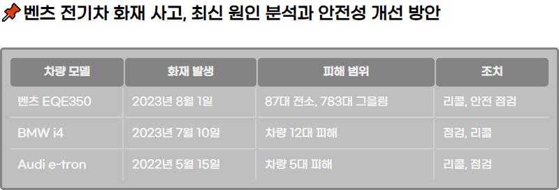๋ฒค์ธ ์ ๊ธฐ์ฐจ์์ ๋ฐ์ํ ํ์ฌ ์ฌ๊ณ ์ ๋ํ ์ต์ ์ ๋ณด์ ์์ธ ๋ถ์์ ์ ๊ณตํฉ๋๋ค. 2023๋ 8์ 1์ผ ๋ฐ์ํ ๋ฒค์ธ EQE350 ์ ๊ธฐ์ฐจ ํ์ฌ ์ฌ๊ฑด์ ์ค์ฌ์ผ๋ก, ์ฌ๊ณ ์์ธ, ํผํด ์ํฉ, ๊ทธ๋ฆฌ๊ณ ์์ ์ฑ ๊ฐํ ๋ ธ๋ ฅ์ ๋ค๋ฃน๋๋ค. ๋ฒค์ธ ๋ ์์ ์ฑ ํ๋ณต์ ์ํด ๋ฆฌ์ฝ๊ณผ ์ ๊ฒ์ ์งํํ๊ณ ์์ผ๋ฉฐ, ์ ๊ธฐ์ฐจ ์์ ์ฑ ๋ฌธ์ ๋ฅผ ํด๊ฒฐํ๋ ค๋ ๋ ธ๋ ฅ์ ๋ํด ์ค๋ช ํฉ๋๋ค.