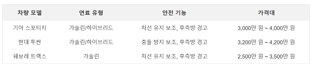 | μ°¨λ λͺ¨λΈ | μ°λ£ μ ν | μμ κΈ°λ₯ | κ°κ²©λ |