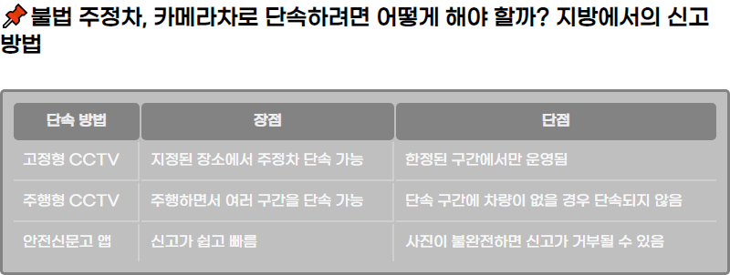 ๋ถ๋ฒ ์ฃผ์ ์ฐจ๋ ๋๋ก์ ์์ ์ ์ํํ๊ณ , ๊ตํต ํ๋ฆ์ ํฐ ์ํฅ์ ๋ฏธ์นฉ๋๋ค. ๋ถ๋ฒ ์ฃผ์ ์ฐจ ๋ฌธ์ ๋ฅผ ํด๊ฒฐํ๊ธฐ ์ํด์ ํจ์จ์ ์ธ ๋จ์์ด ํ์ํ๋ฉฐ, ์ด๋ฅผ ์ํ ๋ค์ํ ๋ฐฉ๋ฒ์ด ์กด์ฌํฉ๋๋ค. ํนํ ์นด๋ฉ๋ผ์ฐจ๋ฅผ ํ์ฉํ ๋จ์์ ๋ง์ ์ง์ญ์์ ํจ๊ณผ์ ์ผ๋ก ์ด๋ฃจ์ด์ง๊ณ ์์ต๋๋ค. ์นด๋ฉ๋ผ์ฐจ๋ ์ฃผ์ ์ฐจ๋ ์ฐจ๋์ ์๋์ผ๋ก ์ธ์ํ์ฌ ๋จ์์ ์คํํ๋ฉฐ, ํนํ ์ง๋ฐฉ ์ง์ญ์์๋ ์ ์ฐจ ํ์ฉ๋๊ณ ์์ต๋๋ค.