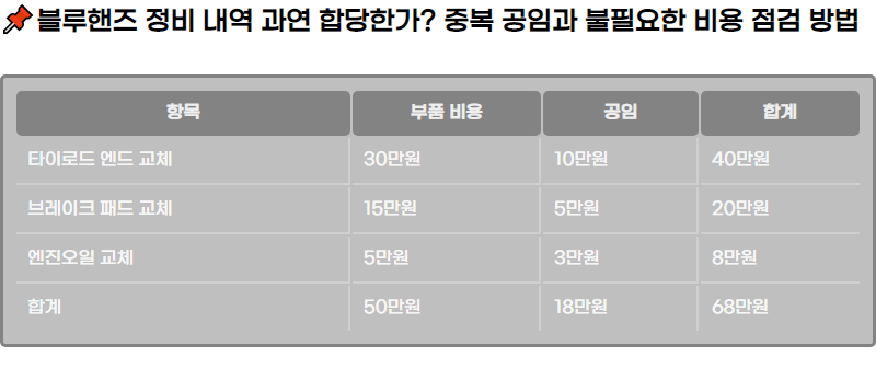 ๋ธ๋ฃจํธ์ฆ์์ ์ฐจ๋ ์ ๋น ํ ์์๋ณด๋ค ๋์ ๋น์ฉ ์ฒญ๊ตฌ๊ฐ ์๋ ๊ฒฝ์ฐ, ์ด๋ฅผ ํ์ธํ๋ ๋ฐฉ๋ฒ์ ์ค์ํฉ๋๋ค. ํนํ ์ฐจ๋ ์ ๋น๊ฐ ์์๋ณด๋ค ๋ง์ด ๋ฐ์ํ๋ฉด, ์ค๋ณต ๊ณต์๊ณผ ๋ถํ์ํ ๋น์ฉ์ด ํฌํจ๋์๋์ง ํ์ธํด์ผ ํฉ๋๋ค.
