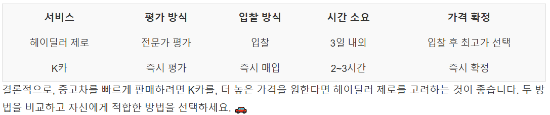 ๊ฒฐ๋ก ์ ์ผ๋ก, ์ค๊ณ ์ฐจ๋ฅผ ๋น ๋ฅด๊ฒ ํ๋งคํ๋ ค๋ฉด K์นด๋ฅผ, ๋ ๋์ ๊ฐ๊ฒฉ์ ์ํ๋ค๋ฉด ํค์ด๋๋ฌ ์ ๋ก๋ฅผ ๊ณ ๋ คํ๋ ๊ฒ์ด ์ข์ต๋๋ค. ๋ ๋ฐฉ๋ฒ์ ๋น๊ตํ๊ณ ์์ ์๊ฒ ์ ํฉํ ๋ฐฉ๋ฒ์ ์ ํํ์ธ์. ๐