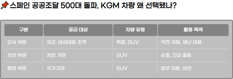 KG๋ชจ๋น๋ฆฌํฐ(KGM)๊ฐ ์คํ์ธ ๊ณต๊ณต ์กฐ๋ฌ ์์ฅ์์ 500๋ ์ด์ ์ฐจ๋์ ๊ณต๊ธํ๋ค. ๊ณต๊ตฐ, ๋น์๋์๋ถ๋, ์์ค ๊ทผ์๋ ๋ฑ ์ฃผ์ ๊ตญ๊ฐ ๊ธฐ๊ด์ ํฝ์