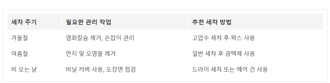 ๊ฒจ์šธ์ฒ ์—๋Š” ๋„๋กœ์— ๋ฟŒ๋ ค์ง€๋Š” ์—ผํ™”์นผ์Š˜์ด๋‚˜ ์—ผ๋ถ„์ด ์ž๋™์ฐจ์˜ ๋„์žฅ๋ฉด์„ ๋ถ€์‹์‹œํ‚ฌ ์ˆ˜ ์žˆ์Šต๋‹ˆ๋‹ค. ๋”ฐ๋ผ์„œ ๊ฒจ์šธ์ฒ ์—๋Š” ์„ธ์ฐจ๋ฅผ ๋” ์ž์ฃผ ํ•ด์ฃผ๋Š” ๊ฒƒ์ด ์ข‹์Šต๋‹ˆ๋‹ค. ์—ผํ™”์นผ์Š˜์ด ์ฐจ๋Ÿ‰์— ๋ฌป์œผ๋ฉด ๋ถ€์‹์ด ๋ฐœ์ƒํ•  ์ˆ˜ ์žˆ๊ธฐ ๋•Œ๋ฌธ์— ์ด๋ฅผ ์„ธ์ฐจ ํ›„ ๊นจ๋—ํ•˜๊ฒŒ ์ œ๊ฑฐํ•ด์•ผ ํ•ฉ๋‹ˆ๋‹ค.