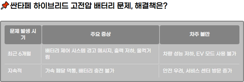 ํ๋์ฐจ์ '์ผํํ ํ์ด๋ธ๋ฆฌ๋'์์ ๋ฐ์ํ ๊ณ ์ ์ ๋ฐฐํฐ๋ฆฌ ๋ฌธ์ ์ ๋ํ ์๋น์ ๋ถ๋ง์ด ์ฆ๊ฐํ๊ณ ์์ต๋๋ค. ์ฃผํ ์ค ์ธ์ปฅ๊ฑฐ๋ฆผ, ์ถ๋ ฅ ์ ํ, EV ๋ชจ๋ ์ฌ์ฉ ๋ถ๊ฐ ๋ฑ์ ์ฆ์๊ณผ ํจ๊ป ๋ฐฐํฐ๋ฆฌ ์ ์ด ์์คํ ๊ฒฝ๊ณ ๋ฉ์์ง๊ฐ ๋จ๋ ๋ฌธ์ ๋ค์ด ๋ณด๊ณ ๋๊ณ ์์ผ๋ฉฐ, ์ด๋ก ์ธํด ๋ง์ ์ฐจ์ฃผ๋ค์ด ๋ถํธ์ ๊ฒช๊ณ ์์ต๋๋ค. ์์ธํ ์ฆ์๊ณผ ํด๊ฒฐ ๋ฐฉ์์ ํ์ธํด ๋ณด์ธ์.