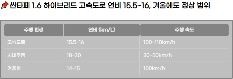 ์ผํํ 1.6 ํ์ด๋ธ๋ฆฌ๋ ๋ชจ๋ธ์ ๊ณ ์๋๋ก ์ฐ๋น๋ ๋์ฒด๋ก 15.5~16km/L์ ๋๋ค. ์ด๋ ๋ง์ ์ด์ ์๊ฐ ๊ธฐ๋ํ๋ ์์ค์ผ๋ก, ํนํ ๊ฒจ์ธ์ฒ ์๋ ๋น์ทํ ์ฐ๋น๊ฐ ๋์ค๊ณ ์์ด ๋งค์ฐ ์์ ์ ์ ๋๋ค. ์ด ์ฐ๋น๋ ๋งค์ฐ ์ฐ์ํ ์์ค์ผ๋ก, ๊ฒจ์ธ์ฒ ๊ธฐ์จ์ด ๋ฎ์์ง๋ฉด ๋ฐฐํฐ๋ฆฌ ํจ์จ์ฑ์ด๋ ์์ง ํจ์จ์ฑ ๋ฑ์ด ๊ฐ์ํ ์ ์์ง๋ง, ์ฌ์ ํ ์ ์ ๋ฒ์ ์์์ ์ฐ๋น๊ฐ ์ ์ง๋๊ณ ์์ต๋๋ค.