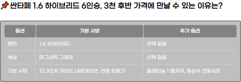 2024๋ ๋ชจ๋ธ์ธ ํ๋ ์ผํํ 1.6 ํ์ด๋ธ๋ฆฌ๋ 6์ธ์น ์ต์คํด๋ฃจ์๋ธ ๋ชจ๋ธ์, ์ต์ ํ์ด๋ธ๋ฆฌ๋ ๊ธฐ์ ์ ์ ์ฉํ์ฌ ์ฐ๋น์ ์ฑ๋ฅ์ ๋ชจ๋ ๊ฐ์ถ ์ฐจ๋์ผ๋ก, ํนํ ๊ฐ๊ฒฉ๋๋น ๊ฐ์ฑ๋น๊ฐ ๋ฐ์ด๋ ๋ชจ๋ธ์ ๋๋ค. ๋ง๊ทธ๋คํฑ ๊ทธ๋ ์ด ์์์ ์ธ๋ จ๋๋ฉด์๋ ๊ณ ๊ธ์ค๋ฌ์ด ๋๋์ ์ฃผ๋ฉฐ, ์ ํํ ์ต์ ๋ค ๋ํ ์ฐจ๋์ ๊ฐ์น๋ฅผ ๋์ฌ์ฃผ๊ณ ์์ต๋๋ค. ์ด ๋ชจ๋ธ์ 6์ธ์น์ผ๋ก, ๋์ ์ค๋ด ๊ณต๊ฐ๊ณผ ํจ๊ป ๋ค์ํ ๊ณ ๊ธ ์ฌ์์ ๊ธฐ๋ณธ์ผ๋ก ์ ๊ณตํ์ฌ ๊ฐ์กฑ ๋จ์ ์ด์ ์์๊ฒ ์ ํฉํฉ๋๋ค.