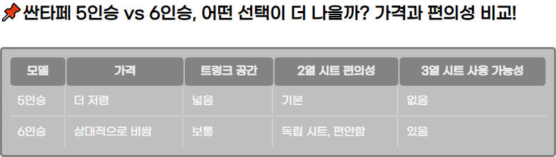 | ๋ชจ๋ธ | ๊ฐ๊ฒฉ | ํธ๋ ํฌ ๊ณต๊ฐ | 2์ด ์ํธ ํธ์์ฑ | 3์ด ์ํธ ์ฌ์ฉ ๊ฐ๋ฅ์ฑ |