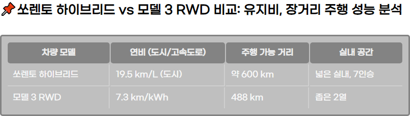 ์๋ ํ ํ์ด๋ธ๋ฆฌ๋์ ํ ์ฌ๋ผ ๋ชจ๋ธ 3 RWD๋ฅผ ๋น๊ตํ๋ฉฐ, ์ฐ๋น, ์ ์ง๋น, ์ค์ฉ์ฑ, ์ฅ๊ฑฐ๋ฆฌ ์ฃผํ ์ฑ๋ฅ ๋ฑ์ ๋ถ์ํ ์์ธ ๋น๊ต์ ๋๋ค.