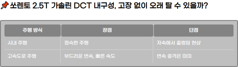 ์๋ ํ 2.5T ๊ฐ์๋ฆฐ ๋ชจ๋ธ์ ํ๊ธฐ์ฐจ์ ๋ํ์ ์ธ ์คํ SUV๋ก, 4๋ฅ ๊ตฌ๋๊ณผ ํจ๊ป ์ต์ ๋์ผ ํด๋ฌ์น ๋ณ์๊ธฐ(DCT)๊ฐ ํ์ฌ๋ ์ฐจ๋์ ๋๋ค. ์ด ๋ชจ๋ธ์ ์ ํํ ๋ ๋ง์ ์๋น์๋ค์ด ๊ฐ์ฅ ๊ถ๊ธํดํ๋ ์ ์ค ํ๋๋ ๋ฐ๋ก ๋ด๊ตฌ์ฑ์ ๋๋ค. ์ต์ DCT๋ ์ ํต์ ์ธ ํ ํฌ ์ปจ๋ฒํฐ ๋ฐฉ์๊ณผ ๋ฌ๋ฆฌ ๋ณ์์ด ๋น ๋ฅด๊ณ ํจ์จ์ ์ด์ง๋ง, ๋ด๊ตฌ์ฑ ๋ฉด์์ ์ฐ๋ ค์ ๋ชฉ์๋ฆฌ๋ ์กด์ฌํฉ๋๋ค.