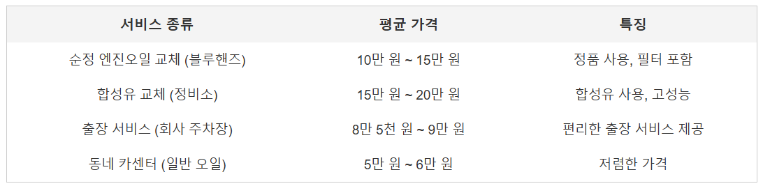 ์์ง์ค์ผ ๊ฐ๊ฒฉ์ ๋ฆฌํฐ๋น ๊ฐ๊ฒฉ์ผ๋ก ์ฑ ์ ๋๋ฉฐ, ์ต๊ทผ์๋ ์ค์ผ ๊ฐ๊ฒฉ ์์น์ผ๋ก ์ธํด ์์ ๋ณด๋ค ๋น์๋๋ค. ์๋ฅผ ๋ค์ด, ํ๋ ๋ธ๋ฃจํธ์ฆ์์ ์์ ์ค์ผ์ ๊ต์ฒดํ๋ ๊ฒฝ์ฐ, ๋ฆฌํฐ๋น 15,000์ ์ ๋๊ฐ ์์๋ ์ ์์ต๋๋ค. ๊ทธ๋ฆฌ๊ณ ํํฐ ๊ต์ฒด๊ฐ ํฌํจ๋๋ฉด ์ ์ฒด ๊ฐ๊ฒฉ์ด ๋ ์ฌ๋ผ๊ฐ ์ ์์ต๋๋ค.