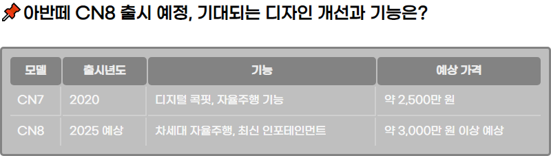 ํนํ, ์๋ฐ๋ผ์ ์๋ก์ด ๋ชจ๋ธ์ ์์ฅ์์ ํฐ ์ฃผ๋ชฉ์ ๋ฐ์ ๊ฒ์ผ๋ก ๋ณด์ด๋ฉฐ, ์ด์ ๋ฐ๋ผ ํ๋์ฐจ๋ CN8์ ์ถ์๋ฅผ ์๋๋ฅผ ๊ฐ๋ฅ์ฑ์ด ํฝ๋๋ค. ๋ํ, CN8 ์ถ์๋ฅผ ์๋๊ณ ์ด๋ฏธ ๋ง์ ์๋น์๋ค์ด ๊ธฐ๋๊ฐ์ ๊ฐ์ง๊ณ ์๊ธฐ ๋๋ฌธ์, ์ถ์ ์ ํ๋ก ๋์ฑ ๋ง์ ์ ๋ณด๋ค์ด ๊ณต๊ฐ๋ ๊ฒ์ ๋๋ค.