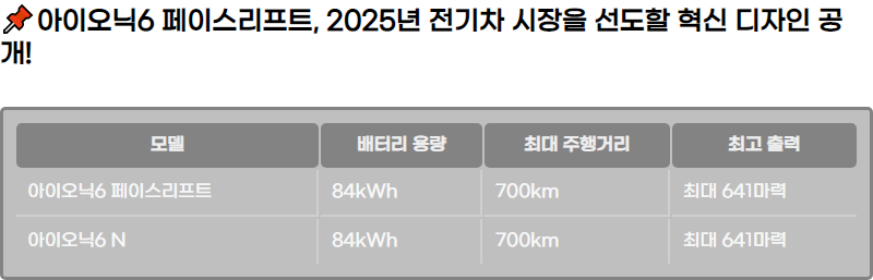 | μμ΄μ€λ6 N | 84kWh | 700km | μ΅λ 641λ§λ ₯ |