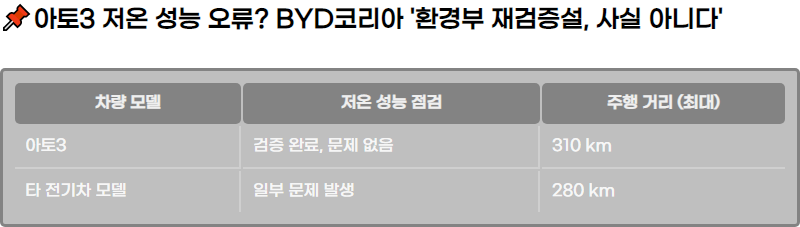 ์ต๊ทผ ์ผ๋ถ ์ธ๋ก ๊ณผ ์ปค๋ฎค๋ํฐ์์๋ ์ํ 3์ ์ ์จ ์ฑ๋ฅ์ ๋ฌธ์ ๊ฐ ์๋ค๋ ๋ณด๋๊ฐ ์์์ต๋๋ค. ๊ทธ๋ค์ ์ฐจ๋์ ์ ์จ ์ฑ๋ฅ์ ๋ํ ํ๊ฒฝ๋ถ์ ์ฌ๊ฒ์ฆ์ด ์ด๋ฃจ์ด์ง ๊ฒ์ด๋ผ๊ณ ์ฃผ์ฅํ์ผ๋, BYD์ฝ๋ฆฌ์ ์ธก์ ์ด์ ๋ํด ๊ฐ๋ ฅํ ๋ฐ๋ฐํ๋ฉฐ "์ฌ์ค์ด ์๋๋ค"๊ณ ๋ฐํ์ต๋๋ค. BYD๋ ๋ชจ๋ ์ฑ๋ฅ ํ ์คํธ๊ฐ ์๋ฃ๋์๊ณ , ์ ์จ ํ๊ฒฝ์์๋ ๋ฌธ์ ๊ฐ ๋ฐ๊ฒฌ๋์ง ์์๋ค๊ณ ๊ฐ์กฐํ์ต๋๋ค.
