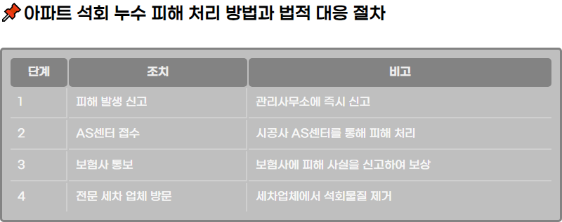 μ μ°¨λ μμ μλ μ°μ κ΄λ¦¬μ¬λ¬΄μμ νΌν΄ μ¬μ€μ μλ¦¬κ³ , νΌν΄ μν©μ 곡μμ μΌλ‘ μ κ³ ν΄μΌ ν©λλ€. νΌν΄κ° λ°μν λ λΆν° κ°λ₯ν λΉ λ₯΄κ² κ΄λ¦¬μ¬λ¬΄μμ μ°λ½μ μ·¨νμ¬, μν©μ κΈ°λ‘ν΄λκ³ μ²λ¦¬ λ°©λ²μ λν μλ΄λ₯Ό λ°μμΌ ν©λλ€. κ΄λ¦¬μ¬λ¬΄μλ ν΄λΉ λ¬Έμ λ₯Ό μ곡μ¬μ ν΅λ³΄νκ³ , μ곡μ¬λ λ€μ ASμΌν°μ μ°λ½νμ¬ νΌν΄ 볡ꡬ μ μ°¨λ₯Ό μ§νν©λλ€. μ΄λ, νΌν΄ λ΄μ©κ³Ό κ΄λ ¨λ μ¬μ§μ μ°μ΄ μ¦κ±°λ‘ μ μΆνλ κ²μ΄ μ’μ΅λλ€.