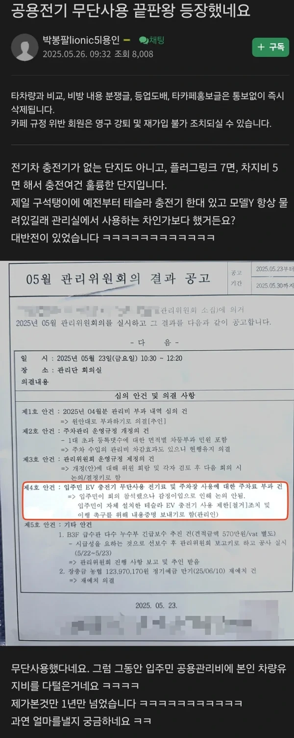 ํด๋น ์ฌ์ง์ ์ ํ ์ด๋ค์ ์ถฉ์ ๊ธฐ๊ฐ ์ฒ์ฅ์ ๊ณ ์ ๋์ด ์๋ ํํ๋ก ๋ณด์ ๊ฐ์ธ์ ์ผ๋ก ์ค์น๋ ๊ฒ์ผ๋ก ์ถ์ ํ๊ณ ์์ต๋๋ค. ์ผ๋ฐ์ ์ผ๋ก ์ํํธ์ ์ ๊ธฐ์ฐจ ์ถฉ์ ๊ธฐ๋ ๊ด๋ฆฌ์ฌ๋ฌด์๋ ์ถฉ์ ์ฌ์ ์์ ์ํด ์ ์์ผ๋ก ์ค์น๋๊ณ ๊ด๋ฆฌ๋ฉ๋๋ค. ๋ํ, ์ฌ์ฉ๋์ ๋ฐ๋ผ ์๊ธ์ ๋ถ๊ณผํ๋ ์์คํ ์ ๊ฐ์ถ๊ณ ์์ต๋๋ค. ๊ทธ๋ฌ๋ ์ด ์ฌ๋ก๋ ์ด๋ฌํ ๊ธฐ๋ณธ์ ์ธ ์ ์ฐจ๋ฅผ ๋ชจ๋ ๋ฌด์ํ ์ฑ, ๊ณต์ฉ ์ ๊ธฐ๋ฅผ ์ฌ์ ์ผ๋ก ์ด์ฉํ์ ๊ฐ๋ฅ์ฑ์ด ๋์ ๋์ฑ ํฐ ๋ ผ๋์ ๋ถ๋ฌ์ผ์ผํค๊ณ ์์ต๋๋ค.