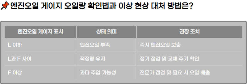 ์—”์ง„์˜ค์ผ ๊ฒŒ์ด์ง€ ํ‘œ์‹œ ์ƒํƒœ ์˜๋ฏธ ๊ถŒ์žฅ ์กฐ์น˜