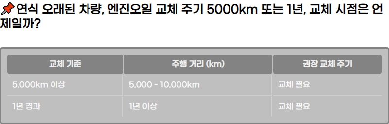 μ€λλ μ°¨λμμλ μμ§ μλͺ μ μ°μ₯νκΈ° μν΄μ κ΅μ²΄ μ£ΌκΈ°λ₯Ό μ§§κ² μ€μ νλ κ²μ΄ μ€μν©λλ€. μ£Όν κ±°λ¦¬κ° λ§κ³ μ°¨λμ΄ μ€λλ κ²½μ°, 5,000kmλ§λ€ μμ§μ€μΌμ κ΅μ²΄νλ κ²μ΄ μ’μ΅λλ€. λν, μμ§μ€μΌμ μ’ λ₯λ₯Ό μ κ²½ μ°λ κ²λ λ§€μ° μ€μν©λλ€. ν©μ±μ λ λ μ€λ μ§μλλ©°, κ³ μ¨μμλ μ 견λ₯λλ€. λ°λΌμ μ€λλ μ°¨λμλ ν©μ±μ λ₯Ό μ¬μ©νλ κ²μ΄ μ’μ΅λλ€.