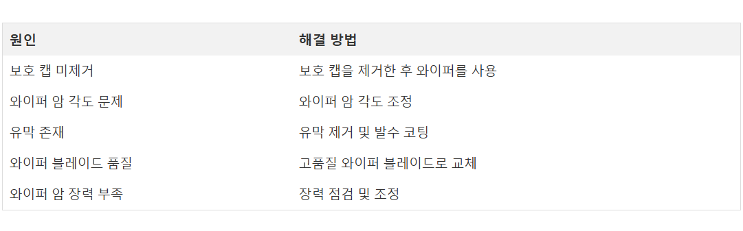 ์ƒˆ ์™€์ดํผ๋ฅผ ์„ค์น˜ํ•œ ํ›„, ๊ฐ€์žฅ ๋จผ์ € ํ™•์ธํ•ด์•ผ ํ•  ์ ์€ ์™€์ดํผ ๋ธ”๋ ˆ์ด๋“œ์— ๋ถ€์ฐฉ๋œ ๋ณดํ˜ธ ์บก์„ ์ œ๊ฑฐํ–ˆ๋Š”์ง€์ž…๋‹ˆ๋‹ค. ์™€์ดํผ ๋ธ”๋ ˆ์ด๋“œ๋Š” ์ผ๋ฐ˜์ ์œผ๋กœ ๋ฐฐ์†ก ์ค‘์— ์†์ƒ์„ ๋ฐฉ์ง€ํ•˜๊ธฐ ์œ„ํ•ด ๋ณดํ˜ธ ์บก์ด ๋ถ™์–ด ์žˆ์Šต๋‹ˆ๋‹ค. ์ด ์บก์„ ์ œ๊ฑฐํ•˜์ง€ ์•Š๊ณ  ์™€์ดํผ๋ฅผ ์‚ฌ์šฉํ•˜๋ฉด, ์œ ๋ฆฌ์™€์˜ ๋ฐ€์ฐฉ๋ ฅ์ด ๋ถ€์กฑํ•ด์ ธ ์†Œ๋ฆฌ๊ฐ€ ๋ฐœ์ƒํ•  ์ˆ˜ ์žˆ์Šต๋‹ˆ๋‹ค. ๋”ฐ๋ผ์„œ, ์ƒˆ ์™€์ดํผ๋ฅผ ์„ค์น˜ํ•  ๋•Œ ๋ณดํ˜ธ ์บก์„ ๋ฐ˜๋“œ์‹œ ๋นผ์ฃผ์–ด์•ผ ํ•ฉ๋‹ˆ๋‹ค.