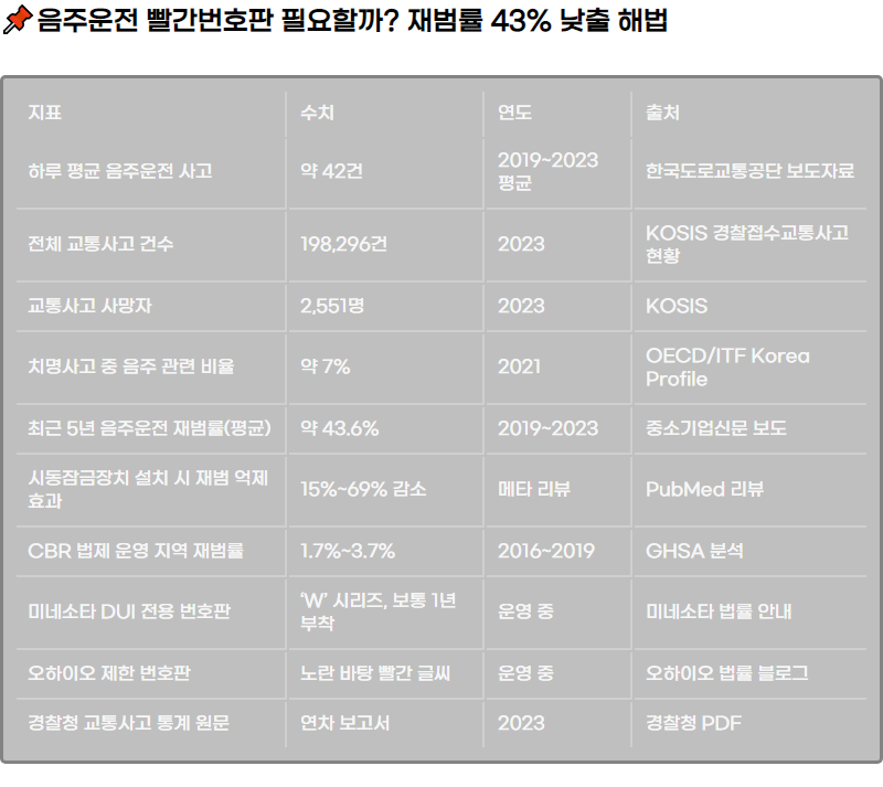 ์์ฃผ์ด์ ์ฌ๋ฒ๋ฅ ์ด ์ต๊ทผ 5๋ ํ๊ท 43.6% ์์ค์ผ๋ก ์ข์ฒ๋ผ ๋ฎ์์ง์ง ์์ต๋๋ค. ํด์ธ์ DUI ์ ์ฉ ๋ฒํธํ๊ณผ ์๋์ ๊ธ์ฅ์น ์ฌ๋ก, ๊ตญ๋ด ํต๊ณ์ ๋ฒ์ ๊ณผ์ ๊น์ง ๊ฒํ ํด ‘๋นจ๊ฐ๋ฒํธํ’ ๋์ ์ด ์ฌ๋ฒ ์ต์ ์ ์ด๋ค ์คํจ๊ฐ ์์์ง ๋์ ํ๊ฒ ๋ถ์ํฉ๋๋ค. ์์น์ ๊ทผ๊ฑฐ๋ฅผ ๋ฐํ์ผ๋ก ์ด์ ๊ณผ ์์ ์ ๊ท ํ ์๊ฒ ์ ์ํฉ๋๋ค.