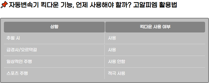 ์๋๋ณ์๊ธฐ ์ฐจ๋์ ์ด์ ํ๋ฉด์ ํฅ๋ค์ด(Kickdown) ๊ธฐ๋ฅ์ ์ ํ ์ ์์ต๋๋ค. ํ์ง๋ง ๋ง์ ์ฌ๋๋ค์ด ์ด ๊ธฐ๋ฅ์ ์ ํํ ์ดํดํ์ง ๋ชปํ๋ ๊ฒฝ์ฐ๊ฐ ๋ง์ต๋๋ค. ํฅ๋ค์ด์ ๊ฐ์ ํ๋ฌ์ ๊น๊ฒ ๋ฐ์ ๋ณ์์ ํ ๋จ ๋ฎ์ถฐ ์ฃผ๋ ๊ธฐ๋ฅ์ผ๋ก, ๊ณ ์ํผ์ ์์ ์๊ฐ์ ์ธ ๊ฐ์์ ์ป์ ์ ์๊ฒ ํด์ค๋๋ค. ์ฃผ๋ก ์ถ์์ด๋ ๊ธ๊ฐ์์ด ํ์ํ ์ํฉ์์ ์ ์ฉํ๊ฒ ์ฌ์ฉ๋์ฃ .