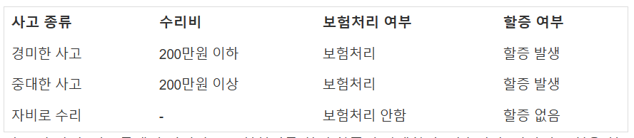 ์ฌ๊ณ ๊ฐ ๋ฐ์ํ๋ฉด ๋ณดํ์ฌ๋ ์ฌ๊ณ ์ ํฌ๊ธฐ๋ณด๋ค๋ ์ฌ๊ณ ๋ฐ์ ํ์๋ฅผ ์ฐ์ ์ ์ผ๋ก ๊ณ ๋ คํฉ๋๋ค. 200๋ง์ ์ดํ์ ์๋ฆฌ๋น๋ก ๋๋๋ ์ฌ๊ณ ๋ผ๋ ๋ณดํ๊ธ ์ฒญ๊ตฌ๊ฐ ๋ฐ์ํ๋ฉด ๋ณดํ์ฌ๊ฐ ํด๋น ์ฌ๊ณ ๋ฅผ ์ฌ๊ณ ๊ฑด์๋ก ์ฒ๋ฆฌํ๊ณ , ๋ณดํ๋ฃ์ ํ ์ฆ์ ์ ์ฉํ๊ฒ ๋ฉ๋๋ค.
