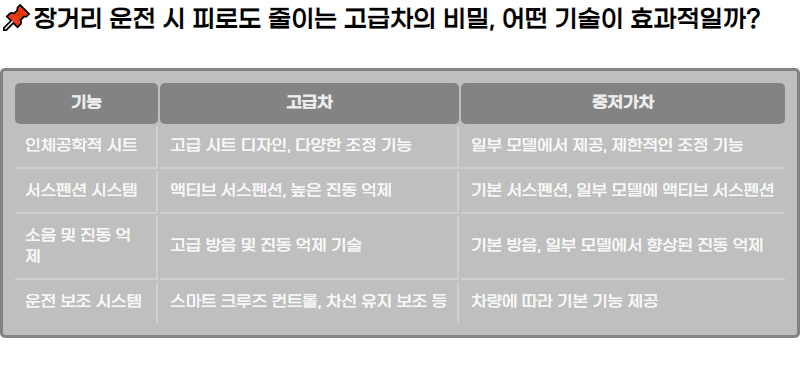 ์ฅ๊ฑฐ๋ฆฌ ์ด์ ์ ํ๋ฉด ์๊ฐ์ด ์ง๋๋ฉด์ ์ ์ฐจ ํผ๋ก๊ฐ์ ๋๋ผ๊ธฐ ๋ง๋ จ์ ๋๋ค. ๊ทธ๋ฌ๋ ๋ชจ๋ ์ฐจ๋์ด ๊ฐ์ ํผ๋ก๋๋ฅผ ์ฃผ๋ ๊ฒ์ ์๋๋๋ค. ๊ณ ๊ธ์ฐจ๋ ๊ทธ ํน์ ์ ํธ์ํจ์ ์ ๊ณตํ์ฌ ์ด์ ์๊ฐ ์ฅ์๊ฐ ๋์ ๋น๊ต์ ๋ ํผ๊ณคํ๊ฒ ์ด์ ํ ์ ์๋๋ก ๋์์ค๋๋ค. ๊ทธ๋ผ ๊ณ ๊ธ์ฐจ๋ ์ด๋ค ๊ธฐ์ ๊ณผ ๊ธฐ๋ฅ์ ํตํด ์ด์ ์์ ํผ๋ก๋๋ฅผ ์ค์ผ๊น์?