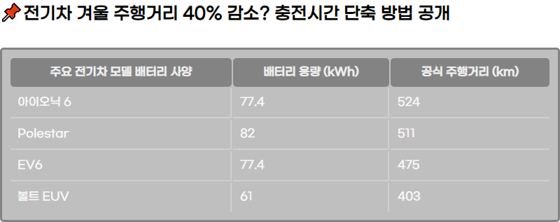 ๊ฒจ์ธ์ฒ ์๋ ์ ๊ธฐ์ฐจ๋ฅผ ์ด์ ํ ๋ ์ฃผํ๊ฑฐ๋ฆฌ ๊ฐ ํ์๋ณด๋ค ๋์ ๋๊ฒ ์ค์ด๋ค๊ณ , ๊ธ์์ถฉ์ ์๋ ๋ ํฌ๊ฒ ๋๋ ค์ง๋ ํ์์ด ๋ํ๋ฉ๋๋ค. ์ด ๋ฌธ์ ๋ ๋จ์ํ ์ฒด๊ฐ์ด ์๋๋ผ ์ธ๊ณ์ ์ธ ์ ๊ธฐ์ฐจ ์ฌ์ฉ์์ ์ ์กฐ์ฌ ๋ชจ๋๊ฐ ํ์ธํ ๊ธฐ์ ์ ํน์ฑ ๋๋ฌธ์ ๋ฐ์ํฉ๋๋ค. ์ผ๋ฐ์ ์ผ๋ก ์ธก์ ๋ ์๋ฃ๋ฅผ ๋ณด๋ฉด ์ฃผํ๊ฑฐ๋ฆฌ๋ ์์จ ๋๋น ์ต๋ 30~40% ์ด์ ์ค์ด๋ค ์ ์๊ณ , ์ถฉ์ ์๋๋ ํฐ ํญ์ผ๋ก ์ ํ๋ฉ๋๋ค.