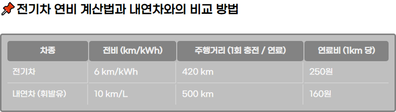 | ์ฐจ์ข | ์ ๋น (km/kWh) | ์ฃผํ๊ฑฐ๋ฆฌ (1ํ ์ถฉ์ / ์ฐ๋ฃ) | ์ฐ๋ฃ๋น (1km ๋น) |