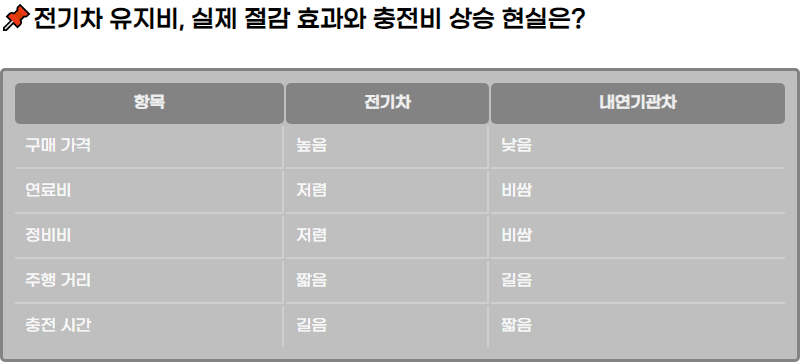 ์ ๊ธฐ์ฐจ์ ์ฅ์  ์ค ๊ฐ์ฅ ํฐ ํํ์ ์ฐ๋ฃ๋น ์ ๊ฐ์ ๋๋ค. ๋ด์ฐ๊ธฐ๊ด์ฐจ์ ๋น๊ตํ์ ๋, ์ ๊ธฐ์ฐจ์ ์ถฉ์ ๋น์ฉ์ ์ ๋ ดํ ํธ์ ์ํฉ๋๋ค. ํ์ฌ ์ ๊ธฐ์ฐจ ์ถฉ์ ๋น๋ ๋ด์ฐ์ฐจ์ ๋นํด ํ์ ํ ๋ฎ์ต๋๋ค. ๋ค๋ง, ์ถฉ์ ๋น์ฉ์ ์ ์ฐจ ์์นํ ๊ฐ๋ฅ์ฑ์ด ์์ผ๋ฉฐ, ์ผ๋ถ ์ถฉ์ ์์์๋ ์์ ์ถฉ์  ๋น์ฉ์ด ์ด๋ฏธ ์ค๋ฅด๊ณ ์์ต๋๋ค. ์ถฉ์ ๋น์ฉ์ด 350์์์ 400์/kWh๋ก ์ฌ๋ผ๊ฐ๋ฉด, ๋ด์ฐ์ฐจ์ ์ฐจ์ด๊ฐ ์ ์ด์ง ๊ฐ๋ฅ์ฑ๋ ์์ต๋๋ค. ์ด๋ฌํ ์ ์ ์ ๊ธฐ์ฐจ์ ๊ฒฝ์ ์  ์ฅ์ ์ ์ํฅ์ ๋ฏธ์น ์ ์์ผ๋, ํฅํ ๊ฐ๊ฒฉ ๋ณ๋์ ๋ํ ๋ชจ๋ํฐ๋ง์ด ์ค์ํฉ๋๋ค.