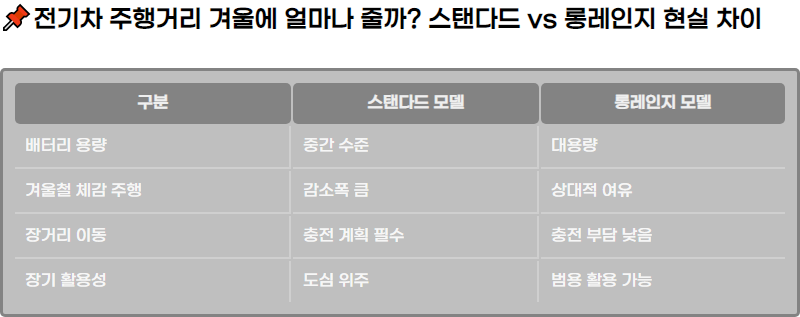 ์ „๊ธฐ์ฐจ ์ฃผํ–‰๊ฑฐ๋ฆฌ ๊ฒจ์šธ์— ์–ผ๋งˆ๋‚˜ ์ค„๊นŒ? ์Šคํƒ ๋‹ค๋“œ vs ๋กฑ๋ ˆ์ธ์ง€ ํ˜„์‹ค ์ฐจ์ด