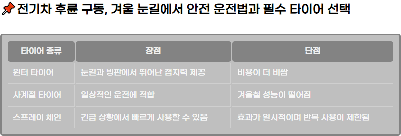 ๊ฒจ์ธ์ฒ ๋๊ธธ์์ ์ ๊ธฐ์ฐจ ํ๋ฅ ๊ตฌ๋ ์ฐจ๋์ ์์ ํ๊ฒ ์ด์ ํ๋ ค๋ฉด ์ ์ ํ ํ์ด์ด ์ ํ์ด ์ค์ํฉ๋๋ค. ์ ๊ธฐ์ฐจ์ ํน์ฑ๊ณผ ๊ฒจ์ธ์ฉ ํ์ด์ด์ ํ์์ฑ, ์์ ์ด์ ํ์ ํ์ธํด๋ณด์ธ์. ํ๋ฅ๊ตฌ๋ ์ฐจ๋์ ์์ ํ ๊ฒจ์ธ์ฒ ์ด์ ๋ฒ๊ณผ ํ์ด์ด ์ ํ์ผ๋ก ๋๊ธธ์์ ์ฌ๊ณ ๋ฅผ ์๋ฐฉํ๋ ๋ฐฉ๋ฒ์ ์๋ ค๋๋ฆฝ๋๋ค.