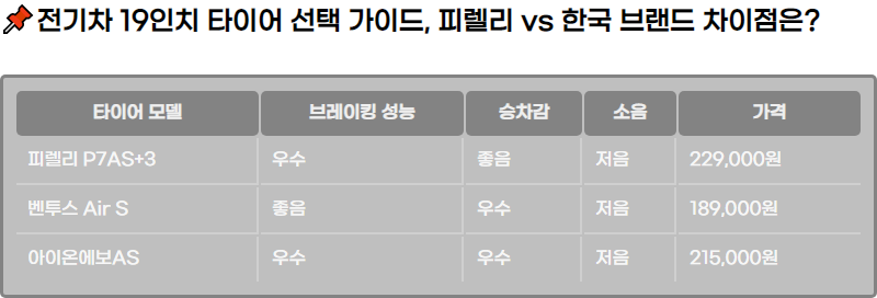 ์ ๊ธฐ์ฐจ์ ํ์ด์ด๋ฅผ ์ ํํ๋ ๊ฒ์ ์ฑ๋ฅ๊ณผ ์์ ์ฑ์ ์ง์ ์ ์ธ ์ํฅ์ ๋ฏธ์นฉ๋๋ค. ์ ๊ธฐ์ฐจ์ ๊ฒฝ์ฐ ์ ํต์ ์ธ ๋ด์ฐ๊ธฐ๊ด ์ฐจ์๋ ๋ค๋ฅธ ํน์ฑ์ ๊ฐ๊ธฐ ๋๋ฌธ์, ํ์ด์ด ์ ํ ์ ๋ช ๊ฐ์ง ์ค์ํ ์์๋ฅผ ๊ณ ๋ คํด์ผ ํฉ๋๋ค. ํนํ, 19์ธ์น ํ์ด์ด๋ ๊ณ ์ ์ฃผํ๊ณผ ์์ ์ฑ์ ์ํ ํ์ ์์๋ก, ์ฌ๋ฌ ๋ธ๋๋๊ฐ ๋ค์ํ ์ฑ๋ฅ์ ์ ๊ณตํ๊ณ ์์ต๋๋ค. ๊ทธ ์ค์์ ํผ๋ ๋ฆฌ, ํ๊ตญ ๋ฒคํฌ์ค Air S, ๊ทธ๋ฆฌ๊ณ ์์ด์จ์๋ณดAS๊ฐ ๋ํ์ ์ธ ์ ํ์ง์ ๋๋ค.