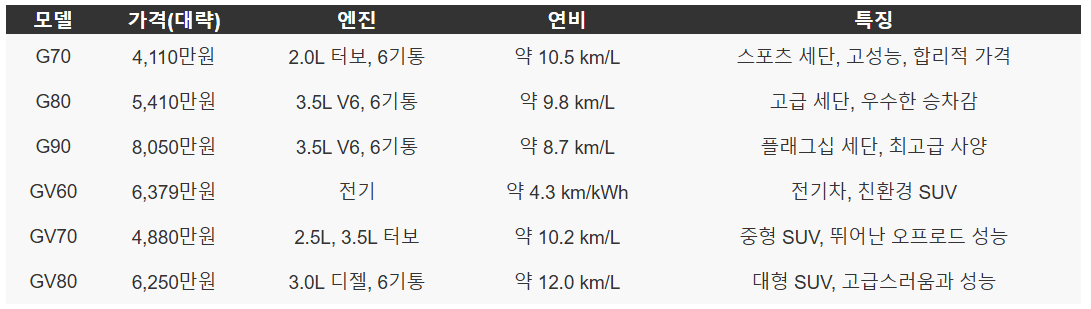 | GV80 | 6,250๋ง์ | 3.0L ๋์ ค, 6๊ธฐํต | ์ฝ 12.0 km/L | ๋ํ SUV, ๊ณ ๊ธ์ค๋ฌ์๊ณผ ์ฑ๋ฅ |